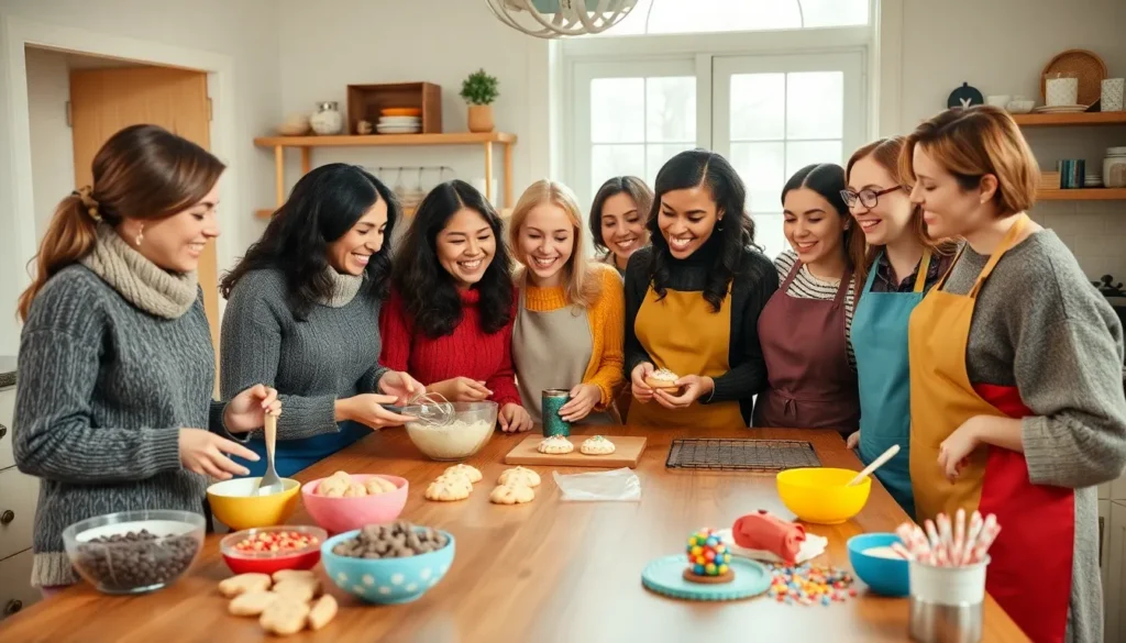 friends happily baking cookies in a cozy kitchen.
